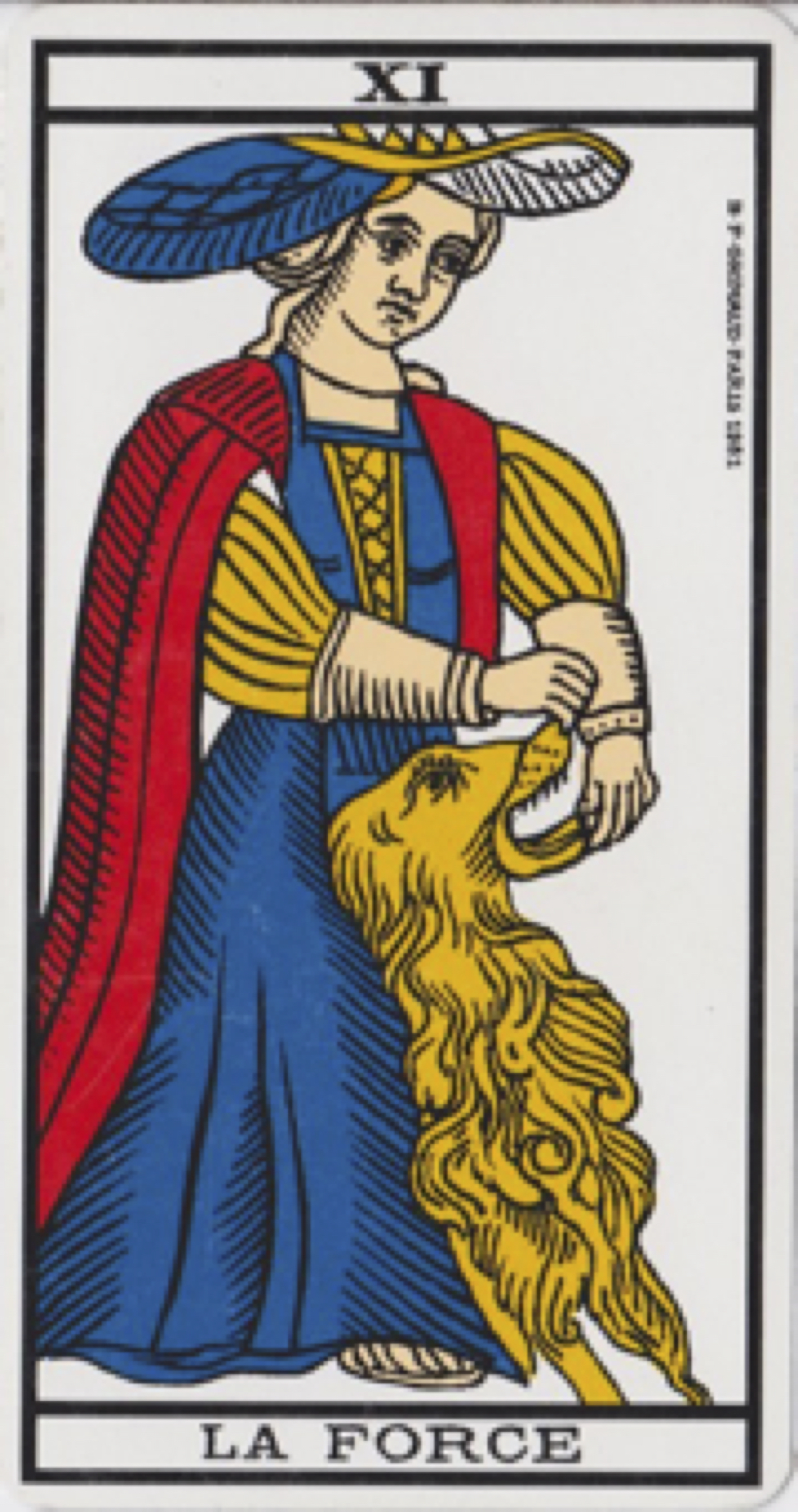 The name of the card, “LA FORCE,” specifies that this is in the sense of personal power over matter.