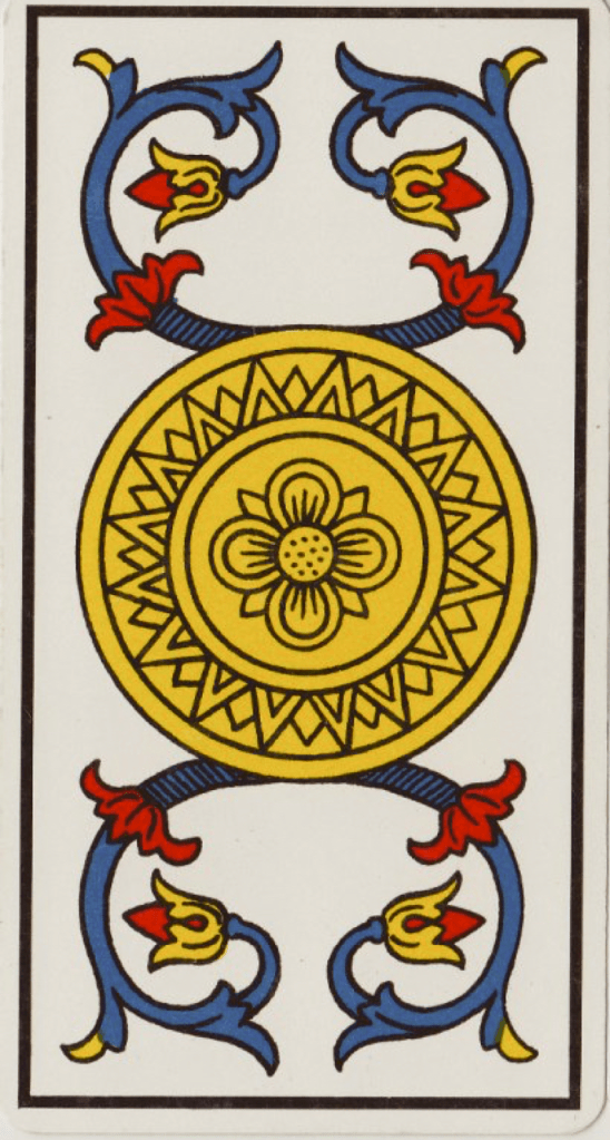 This coin is represented differently from those depicted in the following cards; a simple black line marks the outline, because the unity it symbolizes the radiance which penetrates all.
