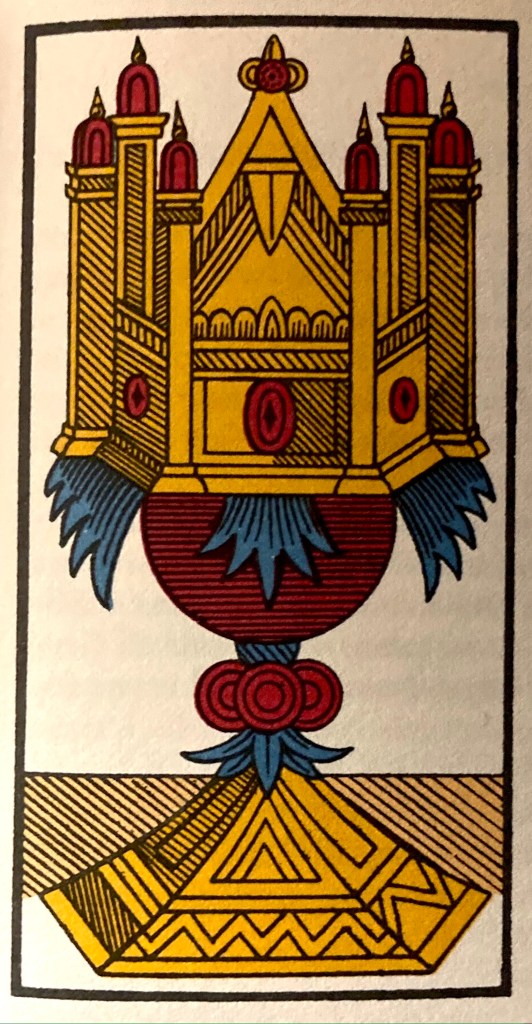 There are but two flowers on the outside, at the top of the card, instead of the four as seen on the two cards or the Nine of Swords. These flowers are the result of the perfection of the Ten of Swords and their equilibrium: activity and passivity, and only the spiritual flowers have been preserved.