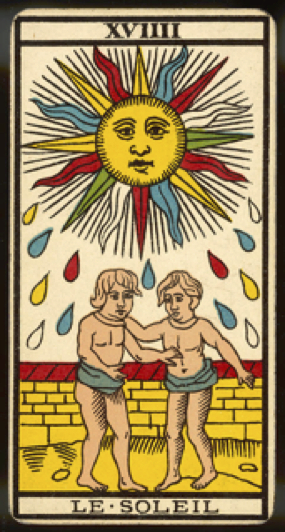 The principles of the Universal, while fusing with those of the Individual, cause matter to vibrate; it is illuminated, achieves autonomy, extends its vibrations and rays over that which surrounds it. This is why Card XVIIII represents the concrete expression of this harmony through the Sun.