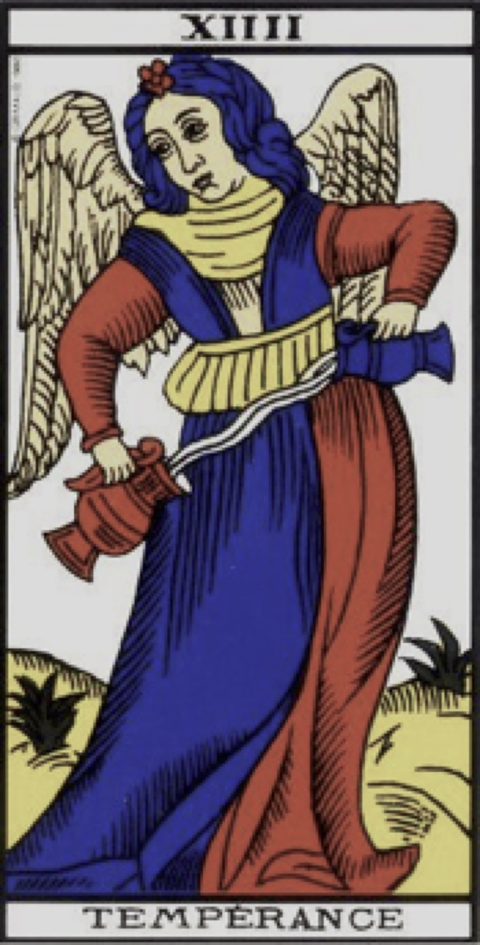 Their waistbands highlight the demarcation of the high and the low, the spiritual and the material, whose fusion has been indicated in the discussion about the number of this card; it is blue to show that there is in this representation neither low principles nor elevated ones, but only a spiritual emanation.
