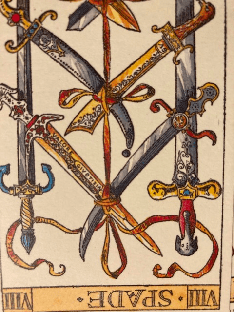 If you look very closely at the Eight of Swords, you can see “Giustizia” (Justice) on one sword and “Valore” (Valor) on another. Notice that this corresponds to Giovanni Vacchetta’s initials. As if to drive the point home, another sword actually bears the initials GV. Here’s a detail of the card inverted: