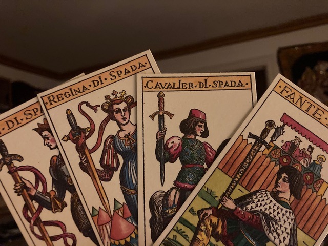 If you look closely at the Two of Swords, you’ll see that Vacchetta has included pictures of a Tarot deck.