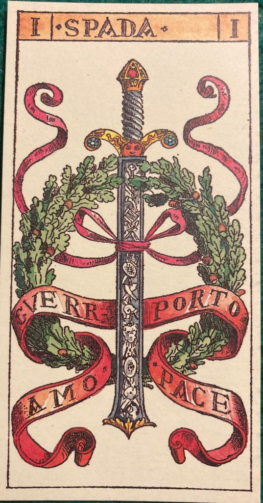 I do not know what the source is of the motto on the Two of Swords, if any. AMO GUERRA, PORTO PACE. “I love war, I bear peace.” Apparently that’s the sword talking.